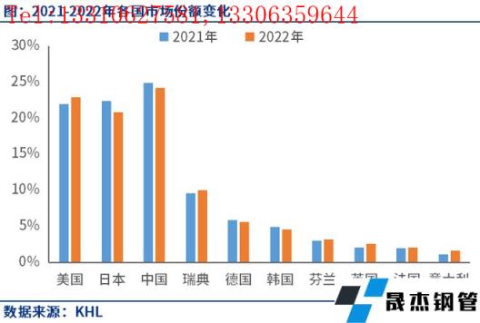 分國別來看,2022年全球各國市場份額排名前三的國家分別是中國、美國、日本,2022年這三個國家市場份額分別為24.2%、22.9%、20.8%,三個國家在全球市場份額已經(jīng)達到了67.9%。其中,中國和日本2022年市場份額分別下降0.7個百分點、1.6個百分點,美國2022年市場份額提高1個百分點。