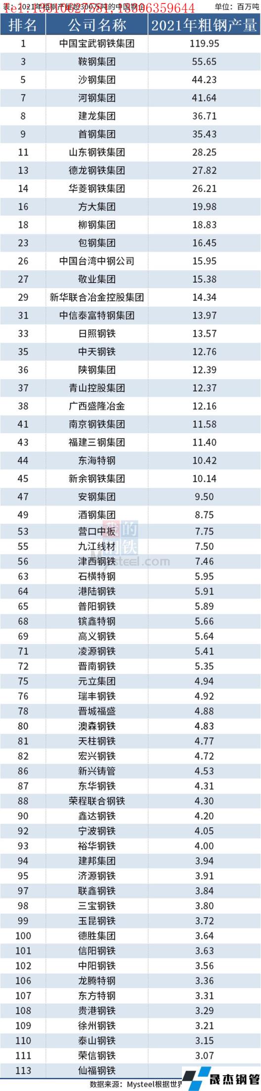 免責(zé)聲明:本網(wǎng)站(山東聊城晟杰無縫鋼管廠www.frdimp.com)刊載的“2021年中國64家重點(diǎn)鋼企粗鋼產(chǎn)量排名”等均源于網(wǎng)絡(luò),版權(quán)歸原作者所有,且僅代表原作者觀點(diǎn),本文所載信息僅供參考。轉(zhuǎn)載僅為學(xué)習(xí)與交流之目的,如無意中侵犯您的合法權(quán)益,請及時聯(lián)系刪除。本網(wǎng)站刊登此篇文章并不意味著本站贊同其觀點(diǎn)或證實(shí)其內(nèi)容的真實(shí)性,我們不對其科學(xué)性、嚴(yán)肅性等作任何形式的保證。如果侵犯了您的版權(quán),請盡快聯(lián)系我們予以撤銷,謝謝合作!