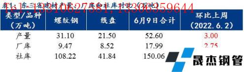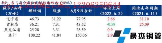 6月2日-8日本周東三省建筑厚壁無縫鋼管產(chǎn)量合計52.60萬噸,較上周增3萬噸;廠庫合計17.99萬噸,較上周增2.75萬噸;總社庫150.06萬噸,較上周增2.99萬噸。