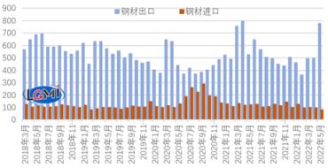 圖1 2018-2022年月度無(wú)縫鋼管 厚壁鋼管進(jìn)出口走勢(shì)