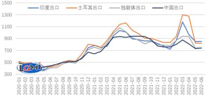 5月份,海外無(wú)縫鋼管 厚壁鋼管市場(chǎng)供需形勢(shì)得以改善,主要出口國(guó)家大幅下調(diào)無(wú)縫鋼管 厚壁鋼管出口報(bào)價(jià)。進(jìn)入6月份,印度加征出口關(guān)稅一定程度提振了熱卷價(jià)格,各國(guó)出口報(bào)價(jià)基本穩(wěn)定,云商平臺(tái)監(jiān)測(cè)數(shù)據(jù)顯示,2022年6月8日,印度、土耳其、獨(dú)聯(lián)體和中國(guó)熱軋卷板出口報(bào)價(jià)(FOB)分別為850美元/噸、820美元/噸、740美元/噸和740美元/噸,與5月底基本持平。