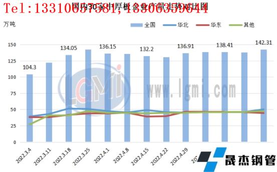 截止2022年5月27日,據(jù)云商平臺監(jiān)測數(shù)據(jù)顯示,國內(nèi)中厚板社會庫存量約為115.5萬噸,環(huán)比增加1.6萬噸左右,月同比增加10.4萬噸左右,年同比增加約2.9萬噸左右。5月份30家樣本鋼企庫存量呈現(xiàn)持續(xù)增長走勢,截止5月27日,追蹤國內(nèi)30家中板鋼企庫存量約為46.6萬噸,與4月份相比基本持平,其中華北區(qū)域14家樣本企業(yè)廠內(nèi)庫存約為22.7萬噸,同比4月份同期增加約5.5萬噸左右,華東區(qū)域12家樣本企業(yè)廠內(nèi)庫存約為15.2萬噸,同比4月份同期下降約2萬噸左右,除華北、華東區(qū)域外,11家樣本企業(yè)廠內(nèi)庫存約為8.7萬噸,同比4月份同期基本持平。
