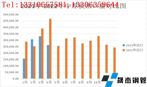 至于出口方面,據(jù)不完全統(tǒng)計,2022年4月份國內(nèi)中板出口量約為26.09萬噸,環(huán)比3月份出口量下降約6.94萬余噸,與2021年同期相比出口量下降約20.51萬噸左右,隨著國外市場復(fù)工復(fù)產(chǎn)節(jié)奏加快,中厚板品種對于國內(nèi)資源依賴性逐步降低。