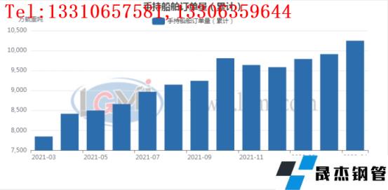 4月份國內(nèi)手持船舶訂單量累計為10247萬載重噸,環(huán)比3月份增長約337萬載重噸。同比21年同期增加約1828萬載重噸。