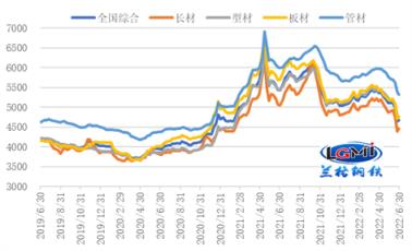 6月份,市場需求淡季特征較為明顯,北方高溫和南方雨季都影響了正常的施工節(jié)奏,下游實(shí)際采購需求釋放力度受限嚴(yán)重,疊加成本支撐力度的減弱,國內(nèi)厚壁鋼管市場呈現(xiàn)明顯的弱勢下跌行情。據(jù)云商平臺監(jiān)測數(shù)據(jù)顯示,截至6月底,全國厚壁鋼管綜合價格為4672元,較上月末下跌412元,環(huán)比跌幅為8.1%,年同比下跌14.0%。其中,長材價格為4452元,較上月末下跌404元,跌幅8.3%,年同比下跌11.9%;板材價格為4755元,較上月末下跌415元,跌幅為8.0%,年同比下跌16.5%;型材價格指數(shù)為4750元,較上月末下跌432元,跌幅為8.3%,年同比下跌12.8%;管材價格為5311元,較上月末下跌421元,跌幅為7.4%,年同比下跌11.4%(詳見圖1)。