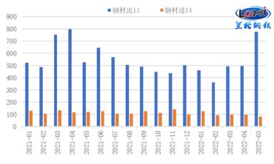 進(jìn)口方面,由于國內(nèi)疫情對制造業(yè)的沖擊仍存,且海外市場價格優(yōu)勢不足,進(jìn)口仍呈下降態(tài)勢。5月份,我國進(jìn)口厚壁鋼管80.6萬噸,環(huán)比下降16.0%,同比下降33.2%;1-5月累計進(jìn)口厚壁鋼管498.0萬噸,同比下降18.3%。