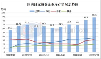 截止2022年6月24日,據(jù)云商平臺(tái)監(jiān)測(cè)數(shù)據(jù)顯示,國(guó)內(nèi)熱軋卷板社會(huì)庫(kù)存量約為264.53萬(wàn)噸,環(huán)比增加20.82萬(wàn)噸。重點(diǎn)城市庫(kù)存整體表現(xiàn)不一,華東區(qū)域受上海復(fù)工復(fù)產(chǎn)影響小幅消庫(kù)為主,華北、華南庫(kù)存持續(xù)累庫(kù)。具體來(lái)看,廣州地區(qū)熱卷社會(huì)庫(kù)存量約為71.00萬(wàn)噸,環(huán)比增加9.09萬(wàn)噸;上海熱卷社會(huì)庫(kù)存量環(huán)比下降4.84萬(wàn)噸至37.00萬(wàn)噸;天津熱卷社會(huì)庫(kù)存量約為8.00萬(wàn)噸,環(huán)比增加0.80萬(wàn)噸。