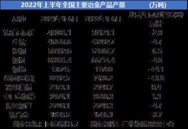 表1 2022年上半年全國(guó)主要冶金產(chǎn)品產(chǎn)量