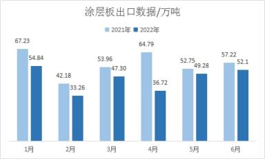 2022年6月我國(guó)鍍層板(帶)出口總量共計(jì)124.86萬(wàn)噸,月環(huán)比降幅5.82%,年同比降幅20.33%;2022年上半年我國(guó)鍍層板(帶)出口總量共計(jì)657.43萬(wàn)噸,年同比降幅15.98%。