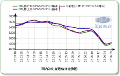 云商平臺(tái)監(jiān)測(cè)數(shù)據(jù)顯示,截至7月29日,全國(guó)1.0mm冷軋市場(chǎng)均價(jià)為4418元(噸價(jià),下同),比6月末下跌507元。主導(dǎo)城市上海唐鋼1.0mm冷軋卷市場(chǎng)價(jià)格為4310元,比6月末下跌540元;北京首鋼1.0mm冷軋卷4410元,比6月末下調(diào)590元;天津唐鋼1.0mm冷軋大卷4300元,比6月末下跌580元。