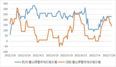 圖3 2022年杭州-唐山、沈陽-唐山焊管價(jià)差走勢圖