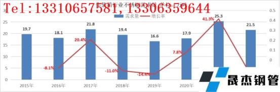 | 各種類(lèi)集裝箱對(duì)不銹鋼需求 集裝箱制造行業(yè)用不銹鋼需求牌號(hào)包括316L、304、304L、430、410L、409L、BN4、443、D-7、QN1803、2205高強(qiáng)度雙相不銹鋼等。其中BN4、443、D-7、QN1803等品種系近年無(wú)縫鋼管廠(chǎng)家為替代304鋼種而研發(fā)的新產(chǎn)品,其中BN4目前為市場(chǎng)廣泛認(rèn)可,推廣使用較快。冷軋不銹鋼需求厚度范圍為0.5mm-3.0mm,寬度范圍為1000 mm -1500 mm,表面等級(jí)包括2B、2D等;熱軋不銹鋼需求厚度范圍為4.0mm-8.0mm,寬度范圍為1000mm-2000mm,表面等級(jí)包括2E、NO.1等。 五、集裝箱行業(yè)的不銹鋼需求量和增長(zhǎng)趨勢(shì)統(tǒng)計(jì)