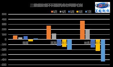 以四周原料庫存測(cè)算各品種的毛利表現(xiàn)來看,隨著7月下旬鋼價(jià)企穩(wěn)反彈,各品種毛利均呈現(xiàn)先降后升狀態(tài),但依然處于虧損負(fù)值區(qū)間,從月度整體來看,虧損幅度較上月有所擴(kuò)大。研究中心測(cè)算數(shù)據(jù)顯示,冷軋卷板的月均虧損擴(kuò)大幅度最大,為403元/噸;三級(jí)螺紋鋼的月均虧損擴(kuò)大幅度最小,為206元/噸;其他品種虧損擴(kuò)大幅度在227-369元/噸之間(詳見圖3)。