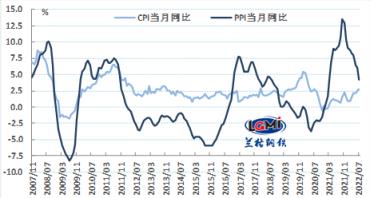 7月份,工業(yè)生產(chǎn)者出廠價(jià)格同比漲幅較上月回落1.9個(gè)百分點(diǎn),同比漲幅回落速度加快,環(huán)比自今年2月份以來(lái)首次下降,且降幅較大。海外主要經(jīng)濟(jì)體經(jīng)濟(jì)增速放緩,貨幣政策持續(xù)收緊,需求收縮壓力加大,后期PPI同比漲幅將保持回落趨勢(shì)。