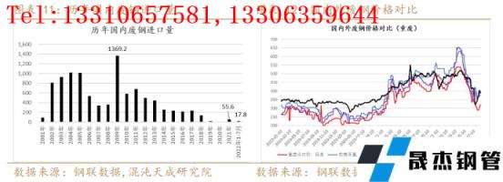 綜合而言,廢鋼供應(yīng)的多寡其實(shí)與厚壁鋼管的需求息息相關(guān),無(wú)論折舊廢鋼、加工廢鋼還是自產(chǎn)廢鋼都與國(guó)內(nèi)厚壁鋼管的消費(fèi)有直接的關(guān)聯(lián),而進(jìn)口廢鋼的增減在一定程度上也可以反映國(guó)外厚壁鋼管消費(fèi)的好壞,所以廢鋼的供應(yīng)量實(shí)際上也是一個(gè)反映需求的指標(biāo),這從廢鋼供應(yīng)基地庫(kù)存與五大材表需的相關(guān)性也可得到佐證。